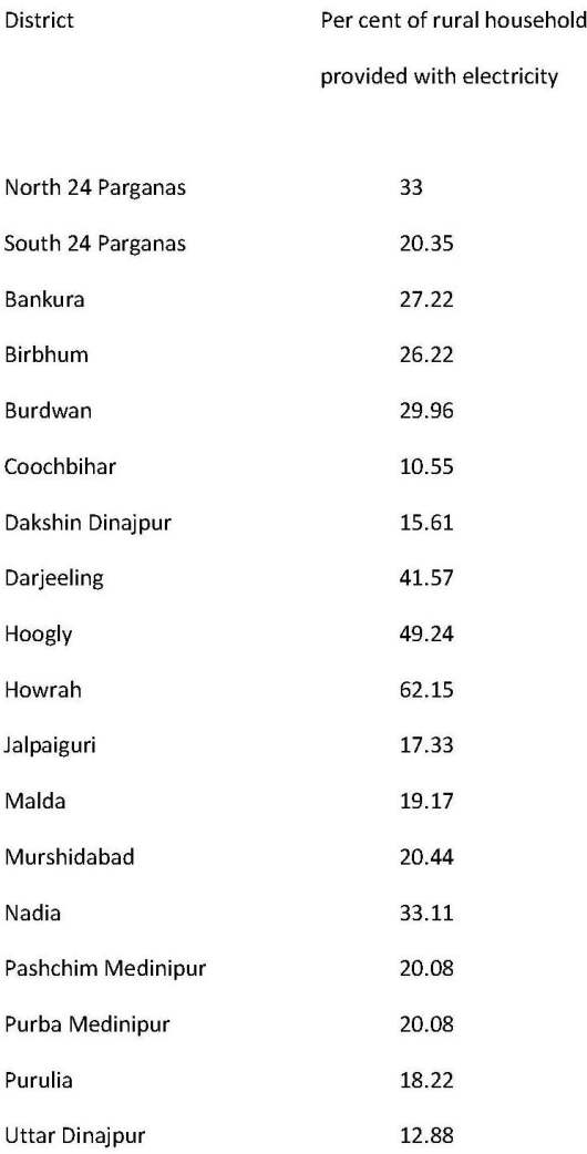 While the problem of rural electrification continues to baffle us, a silent progress has been taking place in different parts of India and, in particular, in West Bengal. Before I reveal to you what the nature of this progress is, here are some district wise details concerning the state of electrification of rural households in West Bengal.
