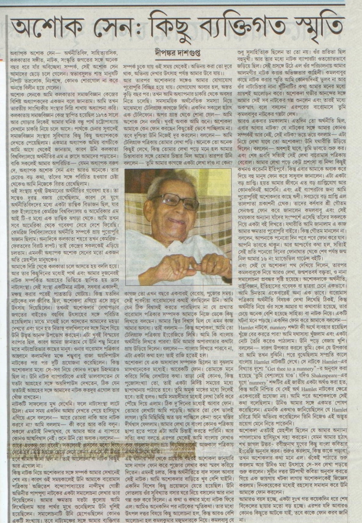 অশোক সেন — কিছু ব্যক্তিগত স্মৃতিকথা — আজকাল পত্রিকা — ২৩ ডিসেম্বর, ২০১৫