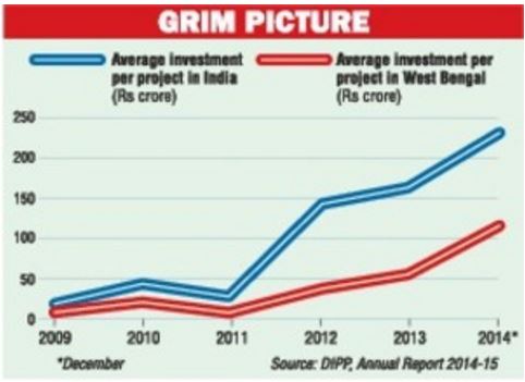 Before proceeding to address these questions in turn, it is worthwhile to ask a third investigative question pertaining to the factual scenario. Is West Bengal truly lagging in terms of investment? The Annual Reports of the Department of Industrial Policy and Promotion (DIPP) published by the Ministry of Commerce and Industry can help resolve this issue. The latest report for 2014-15 throws up data on investment expenditure in the country during the period 2009 through December, 2014, listing in detail the number of investors and the corresponding total investments undertaken annually in the different states as well as the country as whole. For the sake of simplicity, however, it is helpful to study an average figure, investment per project, for the entire economy and that for the state of West Bengal. As the graph illustrates, West Bengal trails behind the country in terms of this average and that the gap appears to be increasing. The figures are not corrected for inflation of course, but the character of the picture is unlikely to change even if the calculations were to be carried out at constant prices.